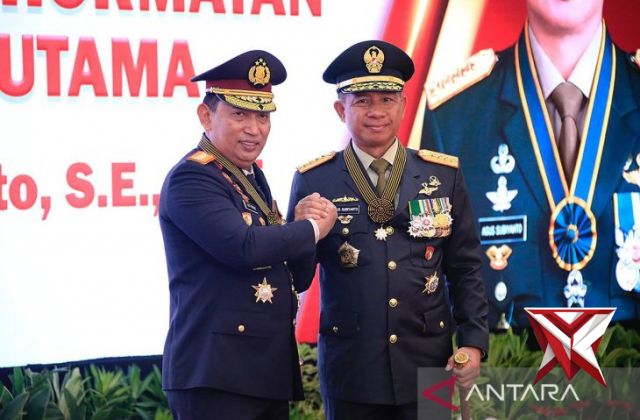Kapolri anugerahkan Bintang Bhayangkara Utama kepada 4 petinggi TNIOct 05, 2024 19:28 - Berita - 531 viewsKapolri Jenderal Pol. Listyo Sigit Prabowo menyematkan tanda kehormatan Bintang Bhayangkara Utama (BBU) kepada Panglima TNI Jenderal TNI Agus Subiyanto di Gedung Rupatama Mabes Polri, Jakarta, Jumat (4/10/2024). ANTARA/HO-Divisi Humas... -