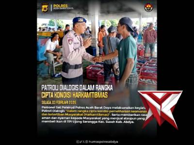 PATROLI DIALOGIS SAT POLAIRUD POLRES ABDYA - PoliceTubeFeb 05, 2026 12:36 - Berita - 32 viewsPersonel Sat Polairud Polres Aceh Barat Daya melaksanakan kegiatan Patroli Dialogis “Dalam rangka cipta kondisi pemeliharaan keamanan dan ketertiban Masyarakat (Harkamtibmas)”. Serta memberikan rasa aman dan nyaman kepada Masyarakat yang menjual ataupun y... -