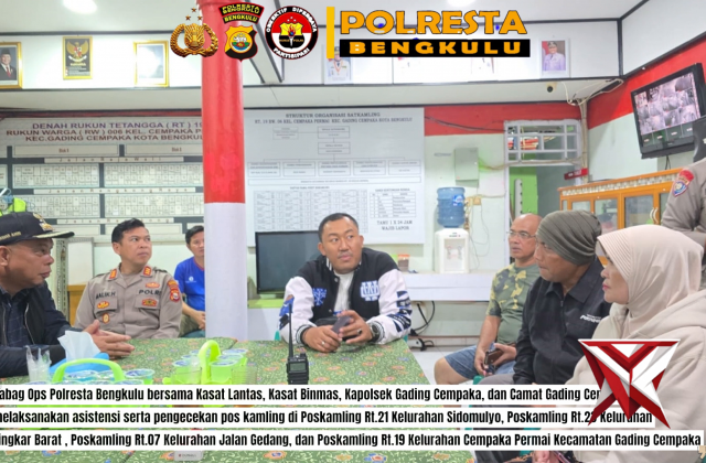 Polresta Bengkulu Laksanakan Asistensi dan Supervisi Pos Kamling di Gading Cempaka Kabag Ops PolresNov 09, 2025 02:20 - Berita - 31 viewsPolresta Bengkulu Laksanakan Asistensi dan Supervisi Pos Kamling di Gading Cempaka Kabag Ops Polresta Bengkulu Yudha Setiawan, S.H bersama Kasat Lantas AKP Aan Setiawan, S.Sos., M.Si, Kasat Binmas AKP Malik Hevri, S.H, Kapolsek Gading Cempaka AKP S. Sapu... -