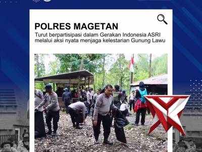 Polres Magetan Dukung Gerakan Indonesia ASRI di Gunung Lawu - PoliceTubeFeb 18, 2026 21:06 - Berita - 18 viewsPolres Magetan turut berpartisipasi dalam Gerakan Indonesia ASRI (Aman, Sehat, Resik, Indah) melalui aksi nyata menjaga kelestarian Gunung Lawu pada Selasa, 17 Februari 2026. Kegiatan ini merupakan wujud kepedulian bersama dalam menjaga lingkungan hidup,... -