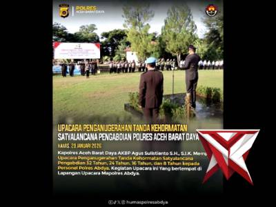 UPACARA PENGANUGERAHAN TANDA KEHORMATAN SATYALANCANA PENGABDIAN POLRES ACEH BARAT DAYA - PoliceTubeJan 31, 2026 11:41 - Berita - 26 viewsKapolres Aceh Barat Daya AKBP Agus Sulistianto S.H., S.I.K. Memimpin Upacara Penganugerahan Tanda Kehormatan Satyalancana Pengabdian 32 Tahun, 24 Tahun, 16 Tahun, dan 8 Tahun kepada Personel Polres Abdya. Kegiatan Upacara ini Yang bertempat di Lapangan Up... -