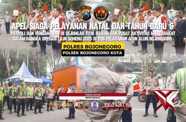 Kapolsek Bojonegoro Kota Pimpin Apel Siaga Pengamanan Nataru & Patroli di Pos Yan Alun-Alun - Police...Dec 26, 2025 15:23 - Berita - 7 viewsDalam rangka memberikan rasa aman dan nyaman kepada masyarakat selama perayaan Natal 2025 dan Tahun Baru 2026, Kapolsek Bojonegoro Kota selaku Kepala Pos Pelayanan (Kaposyan) Alun-alun, AKP Agus Elfauzi, S.Sos., M.M., memimpin apel pengamanan Operasi Lili... -