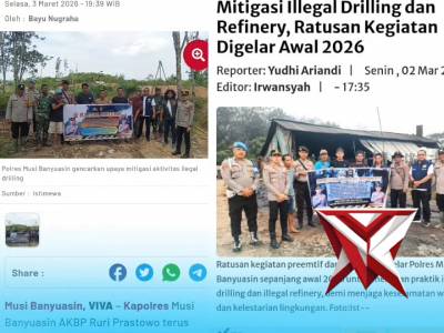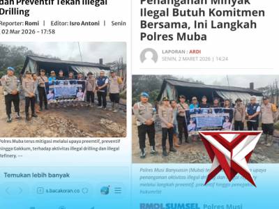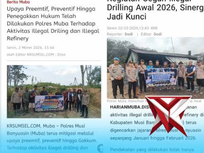 Polres Musi Banyuasin terus mitigasi melalui upaya preemtif, preventif hingga Gakkum,Mar 05, 2026 03:57 - Berita - 2 viewsTribatamubanews.com - Polres Musi Banyuasin terus mitigasi melalui upaya preemtif, preventif hingga Gakkum, iterhadap aktivitas illegal drilling dan illegal Refinery. Selama periode Januari hingga Febuari 2026 tercatat upaya preemtif dilakukan Polres Mu... -