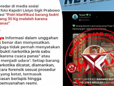 Unggahan hoaxMar 04, 2026 12:30 - Berita - 7 viewsSobat Polri, beredar unggahan di media sosial yang menampilkan foto Listyo Sigit Prabowo dengan narasi bahwa barang bukti sabu hilang karena cuaca panas. Informasi tersebut tidak benar dan menyesatkan. Kapolri tidak pernah menyampaikan pernyataan seperti... -