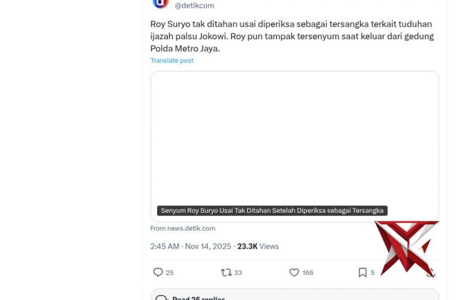 Roy Suryo tak ditahan usai diperiksa sebagai tersangka terkait tuduhan ijazah palsu JokowiNov 15, 2025 23:30 - Berita - 31 viewsRoy Suryo tak ditahan usai diperiksa sebagai tersangka terkait tuduhan ijazah palsu Jokowi. Roy pun tampak tersenyum saat keluar dari gedung Polda Metro Jaya. -
