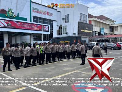 Pengamanan Aksi Unras ABRI-1 di Kejati Bengkulu Berjalan Aman dan Kondusif Personel Polresta BengkuFeb 25, 2026 05:10 - Berita - 12 viewsPengamanan Aksi Unras ABRI-1 di Kejati Bengkulu Berjalan Aman dan Kondusif Personel Polresta Bengkulu melaksanakan monitoring dan pengamanan kegiatan aksi unjuk rasa dari ABRI-1 (Amanah Bangsa Rakyat Indonesia Bersatu) mulai pukul 10.00 WIB hingga selesa... -