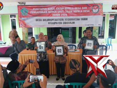 Giat Penetapan Bakal Calon Kepala Desa Dan Pengundian Nomor Urut Calon Kepala Desa BalongmacekanMar 02, 2026 14:19 - Berita - 6 viewsKapolsek Tarik bersama Forkopimka Tarik menghadiri giat Giat Penetapan Bakal Calon Kepala Desa Dan Pengundian Nomor Urut Calon Kepala Desa Balongmacekan, yang berlangsung pada hari Minggu, 1 Maret 2026. Giat berjalan aman dan kondusif. -