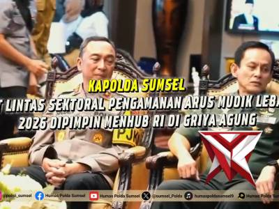 KEGIATAN KAPOLDA SUMSEL RAPAT LINTAS SEKTORAL PENGAMANAN ARUS MUDIK LEBARAN 2026 DIPIMPIN MENHUB RI...Feb 26, 2026 14:20 - Berita - 11 viewsKapolda Sumsel Tegaskan Kesiapan Pengamanan Arus Mudik Lebaran 2026 Palembang - Polda Sumsel menegaskan kesiapan penuh dalam mengamankan arus mudik dan balik Idul Fitri 1447 H/2026 M. Komitmen tersebut ditegaskan langsung oleh Kapolda Sumsel Irjen Pol. D... -