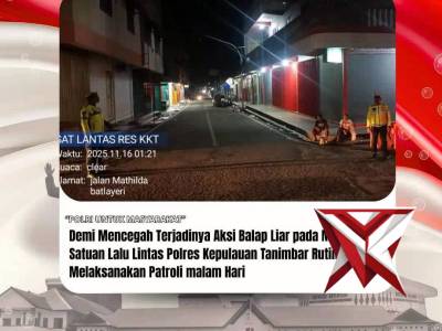 Mencegah terjadinya aksi balap liar pada malam hari - PoliceTubeFeb 05, 2026 02:17 - Berita - 31 viewsSatuan Lalulintas polres Kepulauan Tanimbar rutin melaksanakan patroli malam hari -