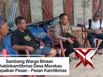 SAMBANGI WARGA BHABINKAMTIBMAS DESA MOREKAU SAMPAIKAN PESAN - PESAN KAMTIBMAS - PoliceTubeFeb 05, 2026 13:37 - Berita - 32 viewsKegiatan Rutin Bhabinkamtibmas Desa Morekau Aipda Jemi Matenahoru sambangi warga binaan, menjalin Komunikasi dan kedekatan dengan masyarakat, sekaligus mengajak warga menjaga keamanan lingkungan sekitar melalui pesan - pesan kamtibmas -