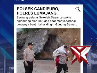 Anggota Polsek Candipuro Polres Lumajang Bantu Menggendong Pelajar untuk Menyebrangi Derasnya Banjir...Feb 25, 2026 18:19 - Berita - 11 viewsSeorang pelajar Sekolah Dasar terpaksa digendong oleh petugas saat menyeberangi derasnya banjir lahar dingin Gunung Semeru di aliran Sungai Regoyo, Desa Jugosari, Kecamatan Candipuro, Selasa (24/2/2026). Tingginya curah hujan menyebabkan debit air mening... -