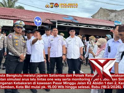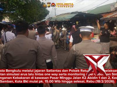 Simulasi One Way dan Penanganan Kebakaran di KZ Abidin, Polresta Bengkulu Bersinergi dengan Pemkot -...Feb 21, 2026 04:49 - Berita - 13 viewsPolresta Bengkulu melalui jajaran Satlantas dan Polsek Ratu Samban melaksanakan kegiatan simulasi arus lalu lintas one way serta monitoring Apel Gabungan Simulasi Penanganan Kebakaran di kawasan Pasar Minggu Jalan KZ Abidin 1 dan 2, Kecamatan Ratu Samban,... -
