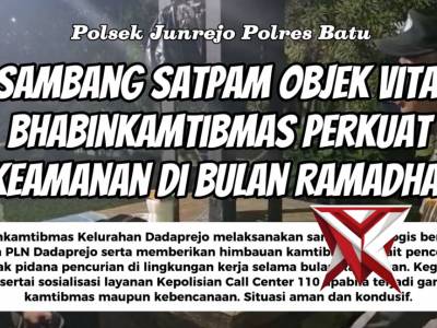Sambang Satpam Objek Vital, Bhabinkamtibmas Perkuat Keamanan di Bulan Ramadhan - PoliceTubeMar 01, 2026 13:50 - Berita - 9 viewsBhabinkamtibmas Kelurahan Dadaprejo melaksanakan sambang dialogis bersama satpam PLN Dadaprejo serta memberikan himbauan kamtibmas terkait pencegahan tindak pidana pencurian di lingkungan kerja selama bulan Ramadhan. Kegiatan juga disertai sosialisasi lay...