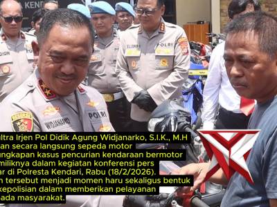 KAPOLDA SULTRA MENYERAHKAN KENDARAAN MOTOR HASIL CURANMOR KEPADA PEMILIKNYAFeb 24, 2026 17:18 - Berita - 8 viewsKapolda Sultra Irjen Pol Didik Agung Widjanarko, S.I.K., M.H menyerahkan secara langsung sepeda motor hasil pengungkapan kasus pencurian kendaraan bermotor kepada pemiliknya dalam kegiatan konferensi pers yang digelar di Polresta Kendari, Rabu (18/2/2026)... -