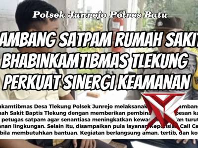 Sambang Satpam Rumah Sakit, Bhabinkamtibmas Tlekung Perkuat Sinergi KeamananMar 03, 2026 01:55 - Berita - 8 viewsBhabinkamtibmas Desa Tlekung Polsek Junrejo melaksanakan patroli sambang dialogis di Rumah Sakit Baptis Tlekung dengan memberikan pembinaan serta pesan kamtibmas kepada petugas satpam agar senantiasa meningkatkan kewaspadaan dan turut menjaga keamanan lin... -