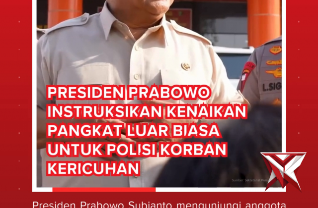 Presiden Prabowo Instruksikan Kenaikan Pangkat Luar Biasa untuk Polisi Korban KericuhanNov 11, 2025 08:40 - Berita - 31 viewsPresiden Prabowo Subianto mengunjungi anggota polisi yang terluka akibat kericuhan beberapa hari terakhir di RS Polri, Kramat Jati, Jakarta Timur, pada Senin (1/9/2025). Dalam kunjungannya, Prabowo menegaskan seluruh petugas yang menjadi korban akan menda... -