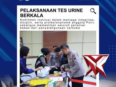 Pelaksanaan Tes Urine BerkalaMar 03, 2026 16:54 - Berita - 6 viewsPelaksanaan Tes Urine Berkala, Selasa (03/03/26). Kegiatan ini merupakan wujud komitmen institusi dalam menjaga integritas, disiplin, dan profesionalisme anggota Polri, sekaligus memastikan seluruh personel bebas dari penyalahgunaan narkoba. Dari hasil p... -