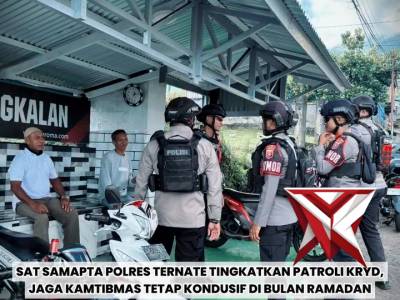 Personel Sat Samapta Polres Ternate melaksanakan patroli Kegiatan Rutin yang Ditingkatkan (KRYD) - P...Feb 24, 2026 14:59 - Berita - 8 viewsPersonel Sat Samapta Polres Ternate melaksanakan patroli Kegiatan Rutin yang Ditingkatkan (KRYD) di sejumlah titik rawan di wilayah Kota Ternate, guna menjaga situasi keamanan dan ketertiban masyarakat (kamtibmas) agar tetap aman dan kondusif, khususnya s... -